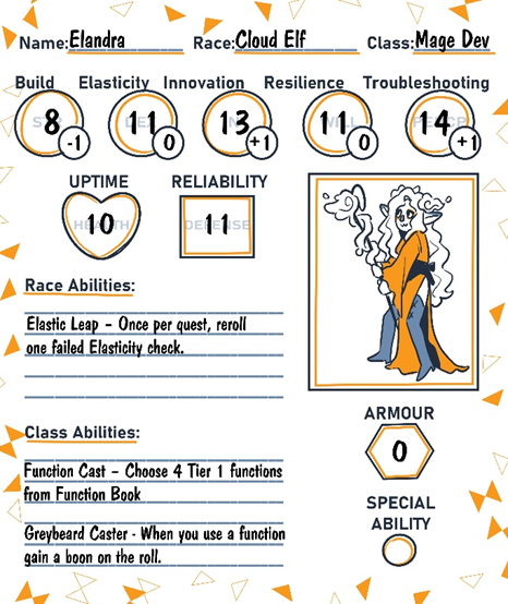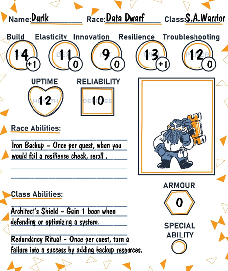 Coming from one of the most ancient ancestries of AWSia, Cloud Elves are said to have laid the first pillars of the land itself. They’re the keepers of foundational knowledge, maintaining order and best practices across the realm through their deep understanding of cloud architecture. Elandra wants to follow in those footsteps, traveling the lands not just to build new systems, but to fix any bug or architectural flaw she encounters. With her mastery of development magic and keen eye for optimization, she’s become the team’s go-to problem solver. But she knows she can’t do it alone.