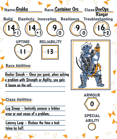 Grokka comes from a lineage of Container Orcs, a tribe famous across AWSia for their exceptional prowess in deploying and orchestrating workloads. Raised on the road, she learned young how to package magic into portable “containers” and launch them wherever needed. Container Orcs value agility and collaboration, bridging gaps between mages, data dwarfs, and all other builders. As a natural Ranger, Grokka stays one step ahead of trouble, automating everything she can and keeping the team’s systems flowing smoothly—and if there isn’t a script for a problem, she’ll write one on the fly.