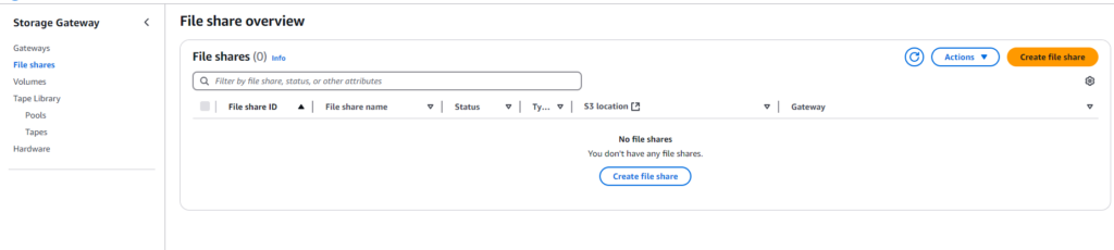 Back to Storage Gateway page, select “File Shares” from the left menu, and let’s create our file share.
