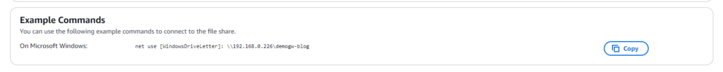 Let’s try to connect to it on our local network - note that in the page information AWS provides commands to connect to the file share.