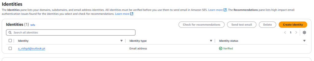 Once the verification is complete, youāll see an Identity created with the email address you provided.
