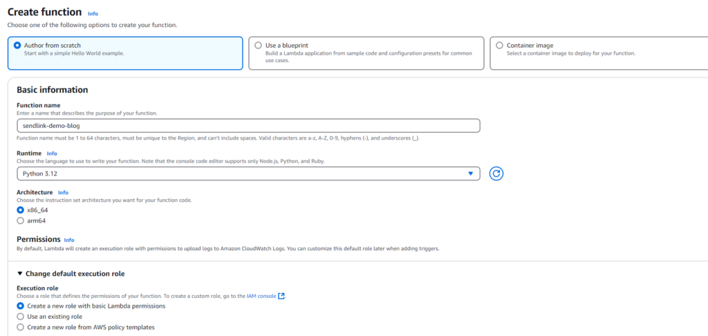 For this demo, Iāll be using Python 3.12 as the runtime. Give your function a name that makes sense for the task, and select the option to create a new role for the function.