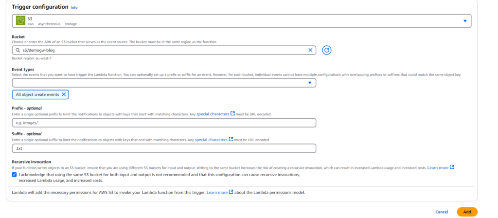 Select the bucket where files are being uploaded, the same that it’s connected to the file share. Here we can also configure “prefix”, what folder the trigger should be coming from and “suffix” what kind of extension does the object have, In this case let’s have the suffix as “.txt” so that it’s trigger when the text file with the information is uploaded.