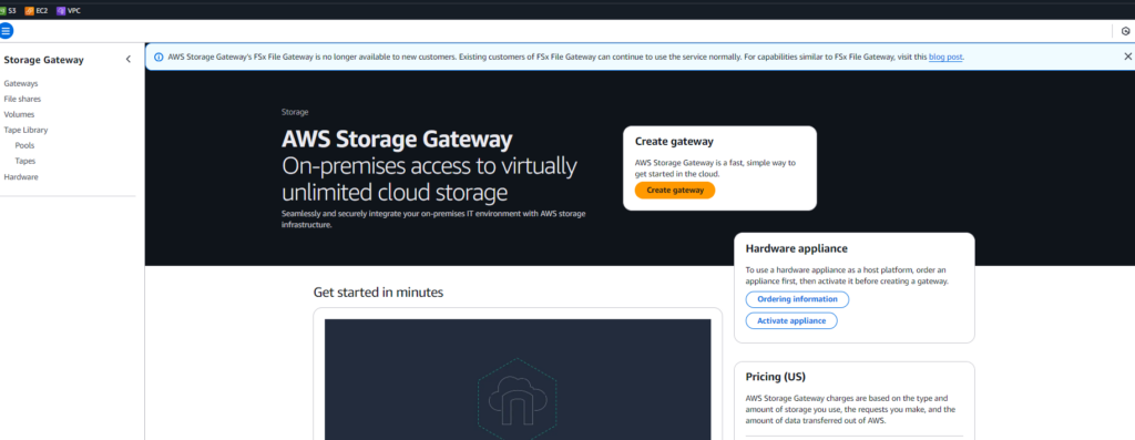 First step: Let’s open the AWS Console and navigate to the Storage Gateway service. I’ll walk you through the setup process step by step.