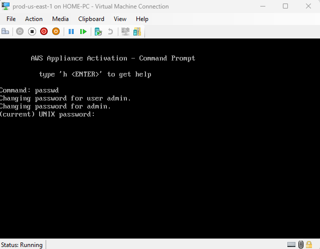 Before we do anything else let’s change the default password, although we can change on the AWS Console after we connect the VM to AWS, let’s change it locally. To do that select the option “7” and write the command “passwd” and write the new password.