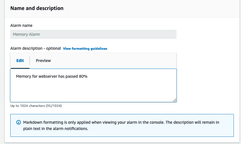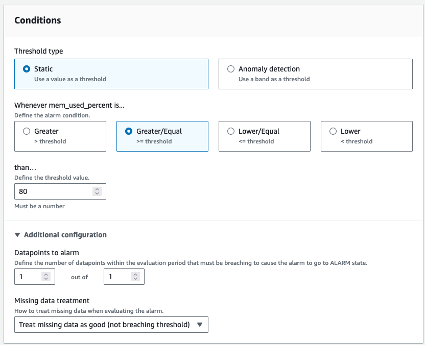 In the alarm creation, setup according to your preferences. For example, let’s create and alarm when the Max memory peaks at 80% sends a email to example@mail.com